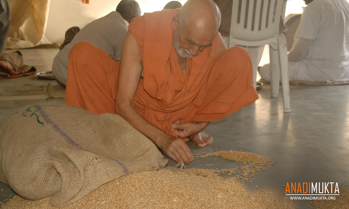 સ્વામિનારાયણ ધામ, ગાંધીનગર ખાતે એક વાર ગુરુવર્ય પ.પૂ.બાપજી સંત આશ્રમના કોઠારમાં પધાર્યા. ત્યાં કોથળા પર બેસી ઘઉં સાફ કરવા મંડ્યા.