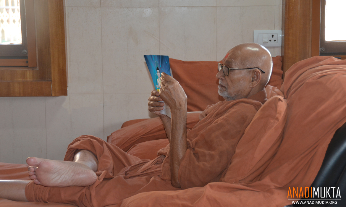 તે સમયે ગુરુવર્ય પ.પૂ.બાપજી SMVS સંસ્થાનના મેગેઝિન‘ઘનશ્યામ’અંકનું વાંચન કરી રહ્યા હતા.અને સાથે સેવક સંતને સમજાવી રહ્યા હતા.તે સમયે સેવક સંત ગુરુવર્ય પ.પૂ.બાપજીના ચરણમાં તળિયા પર મલમ લગાવી રહ્યા હતા.