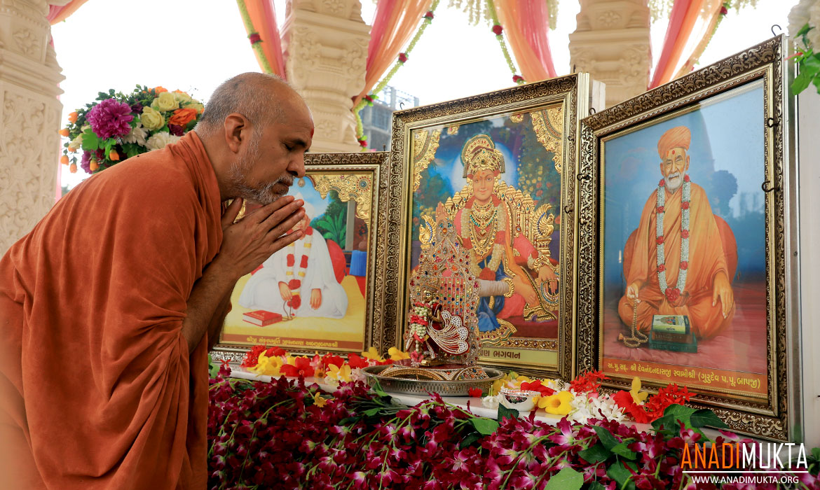 ગુરુદેવ પ.પૂ. બાપજીએ દેખાતો અવરભાવ અદૃશ્ય કર્યો તેને તિથિ મુજબ તા. ૯-૮-૨૦૨૦ના રોજ એક વર્ષ પૂર્ણ થતાં આજરોજ ગુરુવર્ય પ.પૂ. સ્વામીશ્રીએ સ્મૃતિ પૂજન વિધિનો લાભ લીધો હતો. પુષ્પોથી આચ્છાદિત અનાદિમુક્ત પીઠિકાનું દર્શન અણમોલ હતું. આજે મેઘરાજાને પણ ગુરુવર્ય પ.પૂ. સ્વામીશ્રીના સ્પર્શનો જાણે લાભ ન લેવો હોય ! તેમ અનરાધાર મેઘ વરસાવ્યો. પૂ. સંતોએ ગુરુવર્ય પ.પૂ. સ્વામીશ્રીને પ્રાર્થના કરી, “આપ વરસાદમાં ન પધારશો. સંતો પૂજન કરી લઈએ...” છતાં આત્મબુદ્ધિ ને ગુરુ મહિમાનું સાક્ષાત્ સ્વરૂપ કેમ રહી શકે ? આગ્રહપૂર્વક ગુરુજીએ કહ્યું, “જવાનું જ છે.”