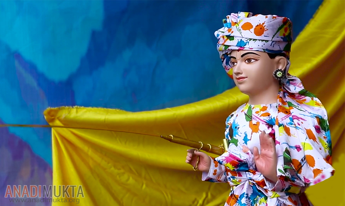 ત્યારે શ્રીજીમહારાજે તેમને કહ્યું : “રમવાની આ રીત નથી. એક પક્ષે અમે અને અમારા સંતો તથા બીજે પક્ષે અમારા ભક્તો.” એમ કહી શ્રીજીમહારાજે રંગનાં માટલાં, ગુલાલના ટોપલાં મંગાવ્યાં. રાઠોડ ધાધલે શ્રીજીમહારાજના હસ્તમાં સુવર્ણની પિચકારી આપી અને શ્રીજીમહારાજે રંગે રમાડવાની શરૂઆત કરી. સામસામા પરસ્પર રંગની છોળ્યો ઊછળવા માંડી. ગુલાલના ગોટા ઊડ્યા. નીલરંગી નભ આજે લાલરંગી થઈ ગયું. રંગની ધૂમ મચી ગઈ ! ઢોલીઓ બુંગિયો ઢોલ જોરજોરથી વગાડવા માંડ્યા. સૌને રંગે રમાવાનું શૂરાતન ચડી ગયું. શ્રીજીમહારાજે સૌને રંગભીના-સ્નેહભીના કરી દીધા. શ્રીજીમહારાજને પણ સૌ સંતો-હરિભક્તોએ રંગરેલ કરી દીધા.
