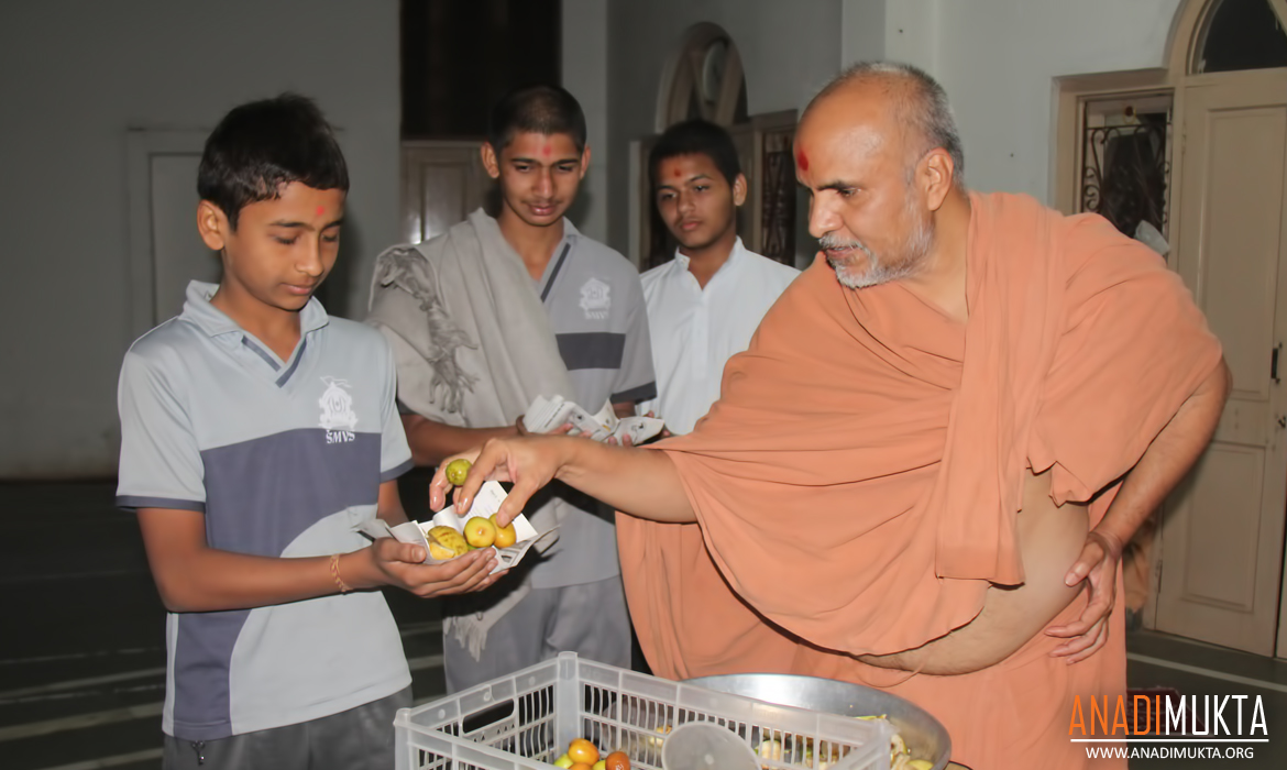 “ગુરુજી, અમને પ્રસાદી આપો છો તો પહેલાં આપ તો લો ! સંતોને આપો તો અમે પ્રસાદી લઈશું.” ગુરુકુલના એક વિદ્યાર્થીમુક્તે ગુરુજીને હાથ જોડી અરજ કરતાં કહ્યું.